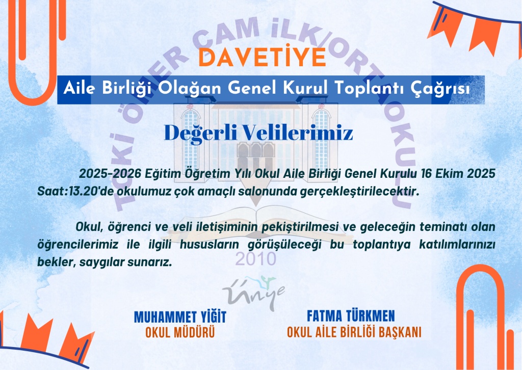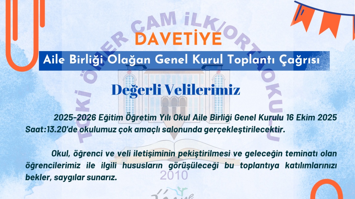2025-2026 Eğitim Öğretim Yılı Okul Aile Birliği Genel Kurulu, 16 Ekim 2025 Saat:13.20'de okulumuz çok amaçlı salonunda aşağıdaki gündem maddelerini görüşmek üzere toplanacatır. Katılımlarınızı bekliyoruz.